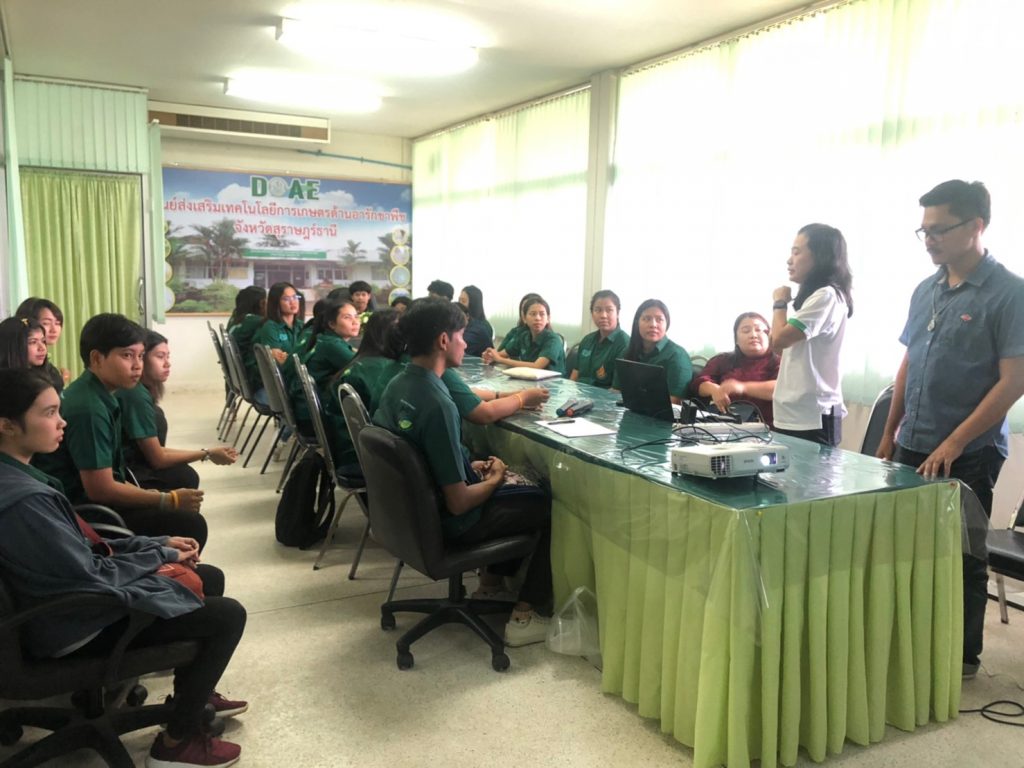 วันที่ 6 พฤศจิกายน 2562 ศูนย์ส่งเสริมเทคโนโลยีการเกษตรด้านอารักขาพืชจังหวัดสุราษฎร์ธานีให้การต้อนรับและถ่ายทอดเทคโนโลยีการป้องกันกำจัดศัตรูพืชโดยชีววิธีพร้อมแนะนำบทบาทภารกิจของศูนย์ฯแก่บุคลากรและนักศึกษาจากมหาวิทยาลัยสงขลานครินทร์ วิทยาเขตสุราษฎร์ธานี จำนวนทั้งสิ้น 24 คน