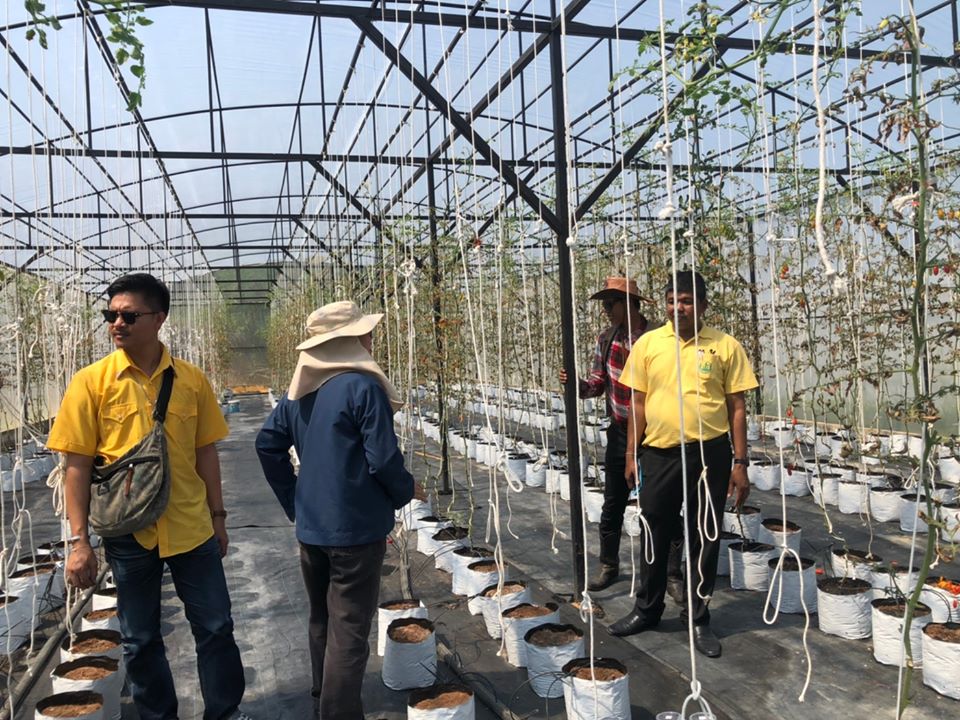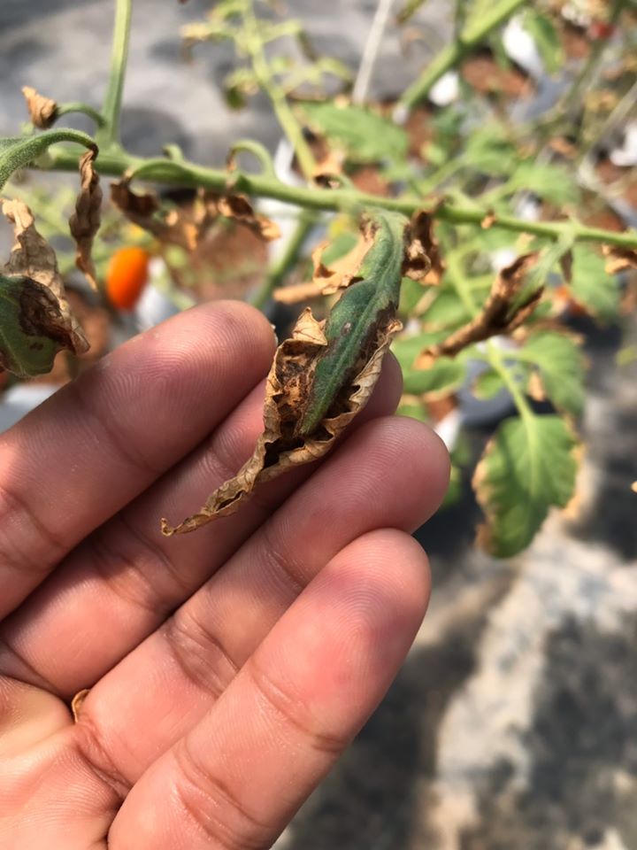วันที่ 24 ธันวาคม 562 นางพรทิพย์ สมวงศ์ นักวิชาการส่งเสริมการเกษตรชำนาญการ พร้อมเจ้าหน้าที่ ของศูนย์ส่งเสริมเทคโนโลยีการเกษตรด้านอารักขาพืช จังหวัดสุราษฎร์ธานี ร่วมกับกลุ่มอารักขาพืช จังหวัดภูเก็ต ตรวจเยี่ยมแปลงปลูกมะเขือเทศเชอรี่ (ในโรงเรือน) พบใบมะเขือเทศแห้งจากตรงกลางใบ มีสีเขียว จากการวินิจฉัยเบื้องต้น คาดว่าน้ำที่ใช้ในการเพาะปลูก อาจมี pH ไม่เหมาะสม จึงแนะนำให้เกษตรกรตรวจวัด pH น้ำก่อนการให้น้ำและปุ๋ย