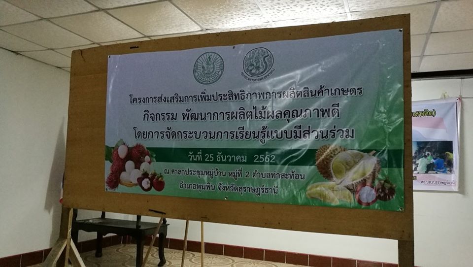 วันที่ 25 ธันวาคม 2562 นางพรทิพย์ สมวงศ์ นักวิชาการส่งเสริมการเกษตรชำนาญการ ร่วมกับสำนักงานเกษตรอำเภอพุนพิน เป็นวิทยากร อบรมให้ความรู้เกษตรกร เรื่อง การป้องกันกำจัดโรคและแมลงในแปลงทุเรียน โครงการส่งเสริมการเพิ่มประสิทธิการผลิตสินค้าเกษตร (ไม้ผล) ณ ศาลาประชุมหมู่บ้าน หมู่ที่ 2 ตำบลท่าสะท้อน อำเภอพุนพิน จังหวัดสุราษฎร์ธานี