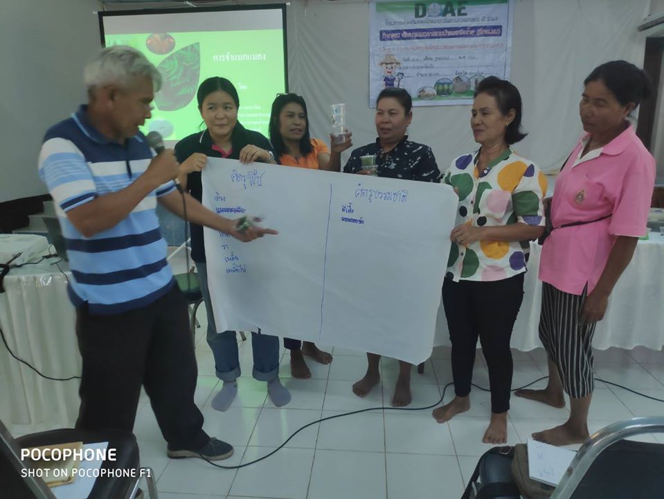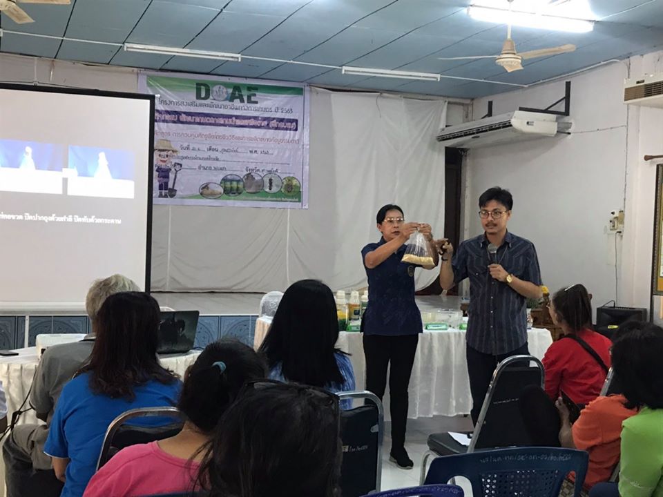 วันที่ 20-21 กุมภาพันธ์ 2563 นายชัยพร นุภักดิ์ ผู้อำนวยการศูนย์ส่งเสริมเทคโนโลยีการเกษตรด้านอารักขาพืชจังหวัดสุราษฎร์ธานี มอบหมายให้นางชนิดา ตะเภาน้อย นักวิชาการส่งเสริมการเกษตรชำนาญการ นายภาณุรักษ์ ประทับกอง นักวิชาการส่งเสริมการเกษตร และเจ้าหน้าที่ ศทอ.สฎ พร้อมด้วยเจ้าหน้าที่สำนักงานเกษตรอำเภอพระแสง จังหวัดสุราษฎร์ธานี จัดฝึกอบรมโครงการส่งเสริมและพัฒนาอาชีพทางการเกษตร ประจำปีงบประมาณ 2563 กิจกรรมฝึกอาชีพแกนนำและเครือข่าย หลักสูตรการควบคุมศัตรูพืชโดยชีววิธีและการผลิตขยายศัตรูธรรมชาติ ณ.ห้องประชุมสหกรณ์นิคมสร้างตนเองพระแสง ตำบลไทรขึง อำเภอพระแสง จังหวัดสุราษฎร์ธานีโดยมีการถ่ายทอดความรู้การจำแนกแมลงทางการเกษตร เพื่อให้เกษตรกรเรียนรู้แมลงที่มีประโยชน์ทางการเกษตร และแมลงศัตรูพืช และวิธีการป้องกันกำจัดศัตรูพืชโดยวิธีผสมผสาน รวมทั้งฝึกปฏิบัติการผลิตขยายแมลงหางหนีบและการผลิตขยายเชื้อบิวเวอเรียเพื่อกำจัดแมลงศัตรูพืช