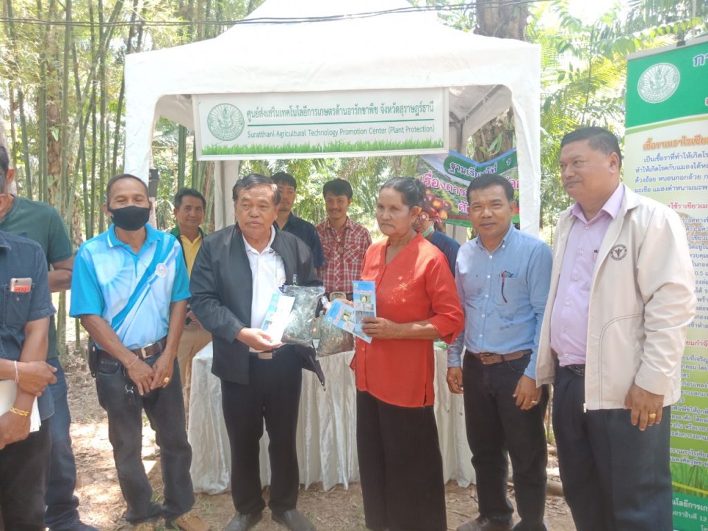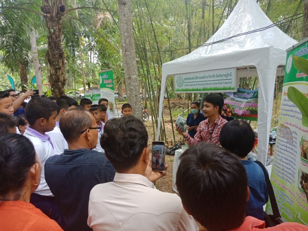 วันที่ 13 มีนาคม 2563 นายชัยพร นุภักดิ์ ผู้อำนวยการศูนย์ส่งเสริมเทคโนโลยีการเกษตรด้านอารักขาพืชจังหวัดสุราษฎร์ธานี มอบหมายให้ นายภาณุรักษ์ ประทับกอง นักวิชาการส่งเสริมการเกษตร และนายปัญจ์ชิเน เชื้อชาญพล นักวิชาการส่งเสริมการเกษตร พร้อมด้วยเจ้าหน้าที่ศทอ.สฎ.เข้าร่วมจัดนิทรรศการถ่ายทอดความรู้การในฐานการป้องกันกำจัดศัตรูพืชโดยได้ให้ความรู้เกษตรกรในด้านการป้องกันกำจัดศัตรูพืชโดยวิธีผสมผสาน (IPM) และแนะนำการใช้พร้อมทั้งสนุับสนุนสารชีวภัณฑ์ และแมลงศัตรูธรรมชาติในการป้องกันกำจัดศัตรูพืชในงานถ่ายทอดเทคโนโลยีเพื่อเริ่มต้นฤดูกาลผลิตใหม่ (Field Day) โดยได้รับเกียรติจากนายสำราญ ครรชิต สมาชิกวุฒิสภา เป็นประธานในการจัดงานฯ ณ ศูนย์การเรียนรู้การเพิ่มประสิทธิภาพการผลิตสินค้าเกษตร อำเภอพระแสง หมู่ที่ 6 ตำบลสินปุน อำเภอพระแสง จังหวัดสุราษฎร์ธานี