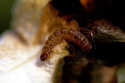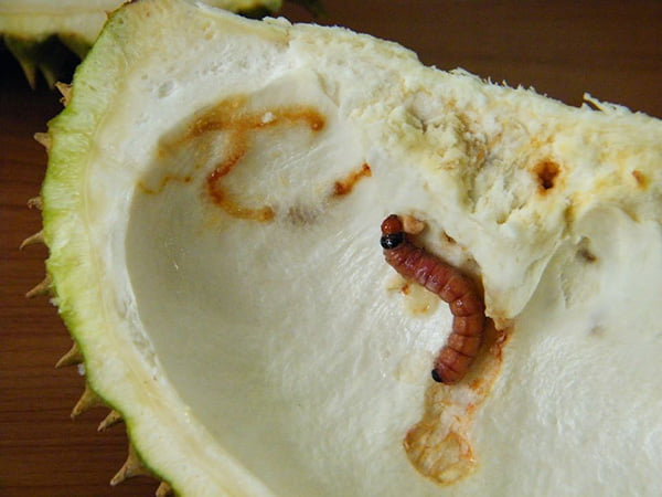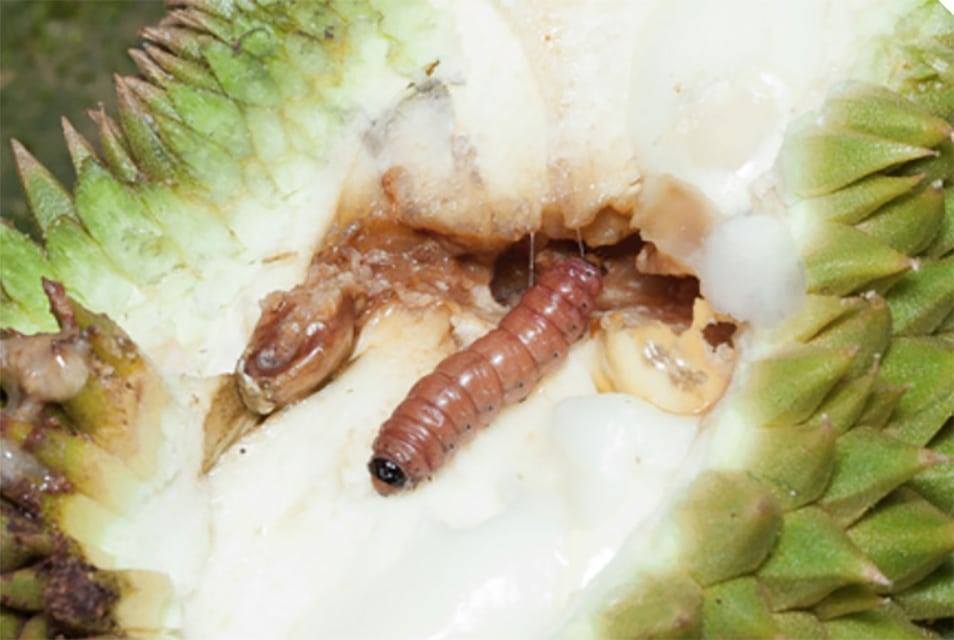 แมลงชนิดนี้มีการระบาดเป็นจุดๆ เกษตรกรที่จันทบุรีเรียกแมลงชนิดนี้ว่า “หนอนใต้” เพราะเข้าใจว่ามีการนำทุเรียนมาจากทางใต้ และมีแมลงชนิดนี้ติดมาด้วย ลักษณะการเข้าทำลาย ตัวเต็มวัยวางไข่ไว้บนผลทุเรียนใกล้ๆกับขั้ว เมื่อหนอนฟักเป็นตัวก็จะไชเข้าไปกัดกินในเมล็ดทุเรียน ส่วนใหญ่จะไชในระยะเมล็ดแข็งแล้ว วงจรชีวิตจากไข่ หนอน ดักแด้ และตัวเต็มวัย ใช้เวลา 2-3 วัน,38 วัน,1-9 เดือน และ 7-14 วันตามลำดับ การป้องกันและกำจัด1.การห่อผลระยะยาวโดยใช้ถุงพลาสติกสีขาวขุ่น 40×75 เซนติเมตร เจาะก้นถุงเพื่อระบายน้ำ โดยเริ่มห่อผลเมื่อทุเรียนมีอายุ 6 สัปดาห์ เป็นต้นไป จนถึงเก็บเกี่ยว2.การป้องกันกำจัดโดยวิธีผสมผสาน พ่นสารฆ่าแมลงในช่วงที่ทุเรียนติดผล เช่น ไซเพอร์เมทริน+ฟอสซาโลน คาร์บาริล หรือสารไพรีทรอยด์สังเคราะห์อื่นๆ ร่วมกับการห่อผลด้วยถุงพลาสติก หมั่นตรวจสอบหาหนอนที่พบในพืชอาศัยอื่นๆ หากพบไม่ควรปล่อยทิ้งไว้เด็ดขาด3.ผลไม้ที่ร่วงหล่นที่พื้นต้องเก็บทำลายเพื่อไม่ให้หนอนเจริญเป็นตัวเต็มวัยและแพร่พันธุ์ได้ต่อไป4.การตั้งกับดักแสงไฟฟ้าเป็นครั้งคราวในคืนเดือนมืดโดยใช้หลอดแบล๊กไลท์ เพื่อสำรวจช่วยในการตัดสินใจป้องกันกำจัดได้ดีขึ้นอ้างอิง: พิสุทธิ์ เอกอำนวย. 2562. โรคและแมลงศัตรูพืชที่สำคัญ. พิมพ์ครั้งที่6. สายธุรกิจโรงพิมพ์. หน้า 162 https://www.thaigreenagro.com/ ทวี เก่าสิริ.2540. โรคพืชและแนวทางการวินิจฉัย.เอกสารเผยแพร่วิชาการ กองโรคพืชและจุลชีววิทยา.กรมวิชาการเกษตร.. 31 หน้า.