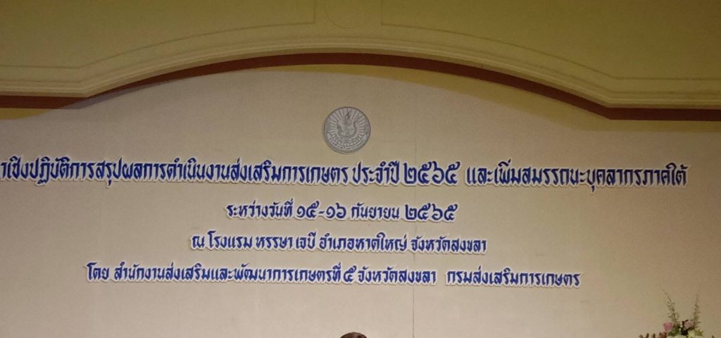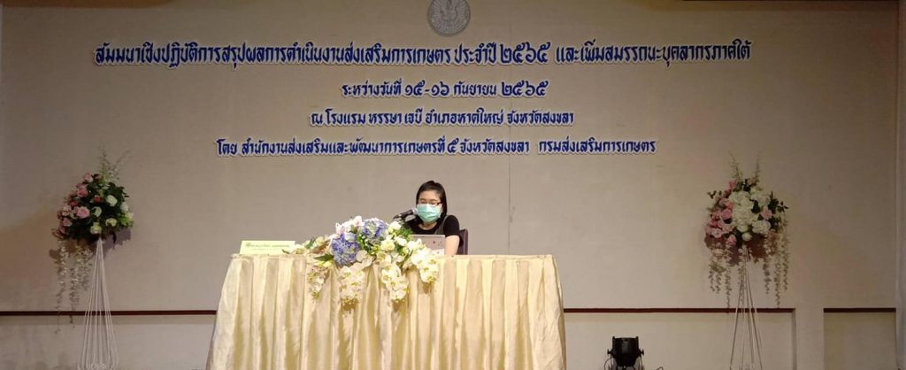 วันที่ 15-16 กันยายน 2565 นายณัทธร รักษ์สังข์ ผู้อำนวยการศูนย์ส่งเสริมเทคโนโลยีการเกษตรด้านอารักขาพืช จังหวัดสุราษฎร์ธานี และเจ้าหน้าที่ศูนย์ฯ เข้าร่วมสัมนาเชิงปฏิบัติการสรุปผลการดำเนินงานส่งเสริมการเกษตร ประจำปี 2565 และเพิ่มสมรรถนะบุคลากรภาคใต้ โดยมีวัตถุประสงค์เพื่อสรุปผลการดำเนินงานประจำปี 2565 วางแผนการดำเนินงาน เพื่อให้เกิดประสิทธิภาพของการดำเนินงานตามนโยบายของกรมส่งเสริมการเกษตรให้สอดคล้องกับบทบาทตามภารกิจ ณ โรงแรมหรรษา เจบี อำเภอหาดใหญ่ จังหวัดสงขลา