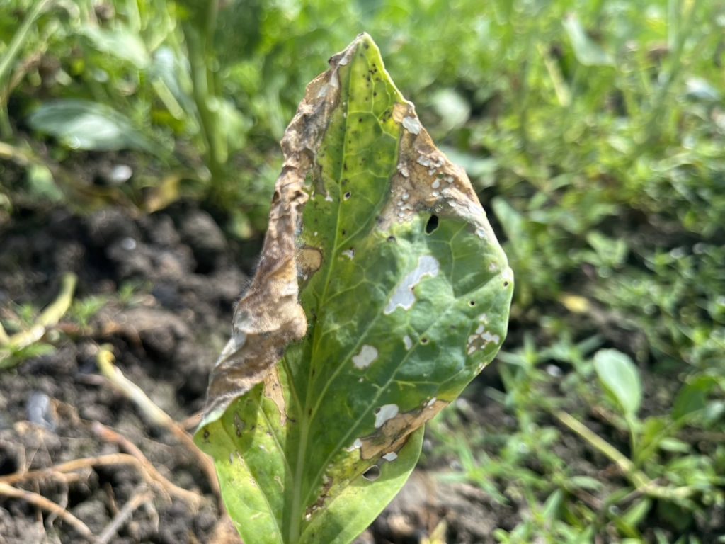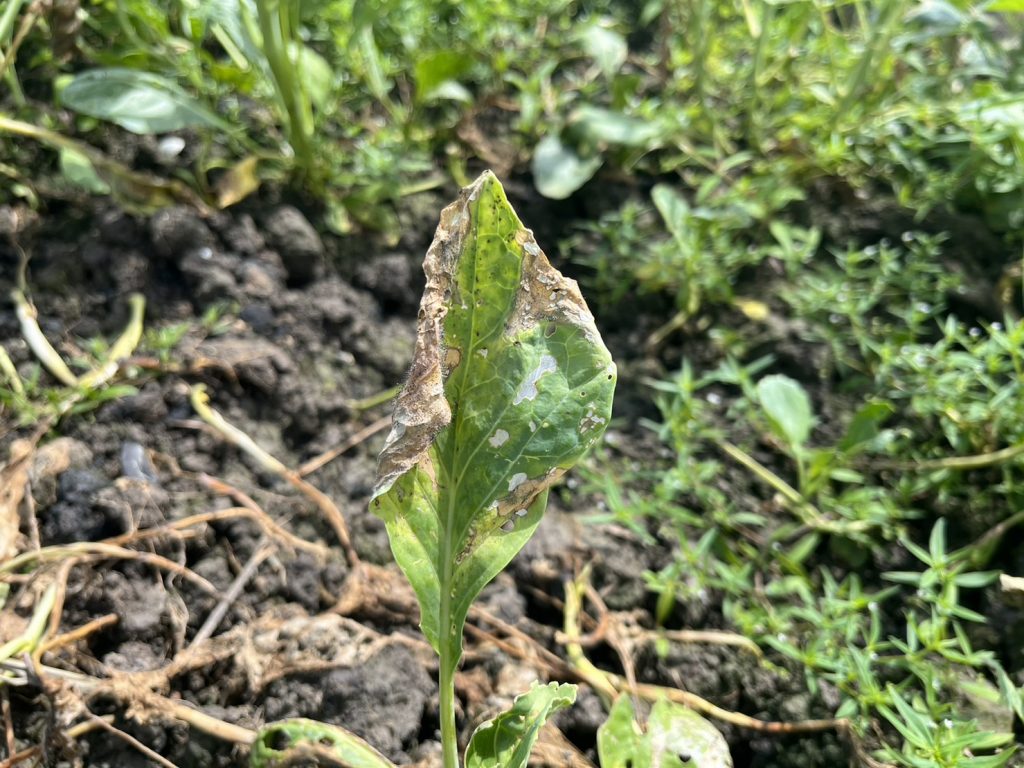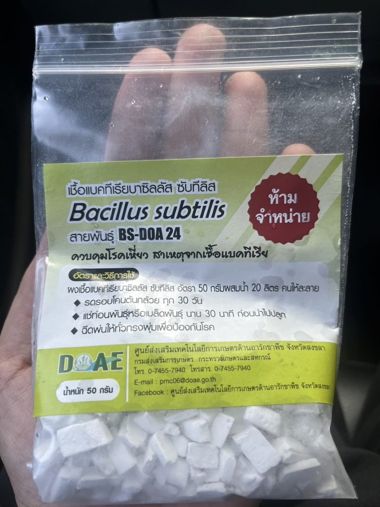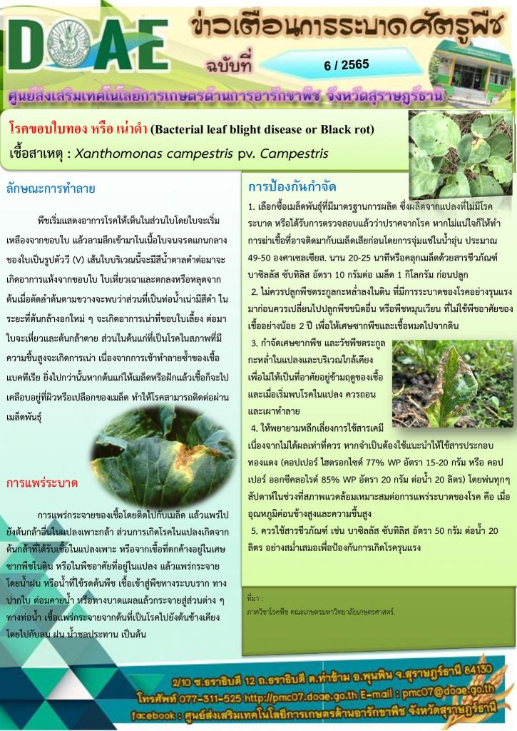 วันที่ 30 กันยายน 2565 นายสุทธิศักดิ์ ทองโอ นักวิชาการส่งเสริมการเกษตรปฏิบัติการ และ นายปัญจ์ชิเน เชื้อชาญพล นักวิชาการส่งเสริมการเกษตร ศูนย์ส่งเสริมเทคโนโลยีการเกษตรด้านอารักขาพืช จังหวัดสุราษฎร์ธานี ได้ลงพื้นที่ติดตามการระบาดของโรคขอบใบทองหรือเน่าดำในกวางตุ้งและคะน้าของแปลง นายสมพล ไทยบุญรอด ประธานแปลงใหญ่ พร้อมทั้งทางศูนย์ฯได้สนับสนุน เชื้อแบคทีเรียบาซิลลัส ซับทีลิส (bacillus subtilis) ซึ่งได้รับการสนับสนุนจาก ศูนย์ส่งเสริมเทคโนโลยีการเกษตรด้านอารักขาพืช จังหวัดสงขลา สำหรับวิธีการใช้เชื้อแบคทีเรียบาซิลลัส ซับทีลิสนั้น ใช้อัตรา 50 กรัมผสมน้ำ 20 ลิตร ผสมสารจับใบคนให้ละลาย ฉีดพ่นทั่วทรงพุ่ม โดยฉีดพ่นช่วงตอนเย็น ห้ามฉีดพ่นช่วงที่มีแสงแดดจัด ณ แปลงผักบางท่าข้าม ตำบลท่าข้าม อำเภอพุนพิน จังหวัดสุราษฎร์ธานี