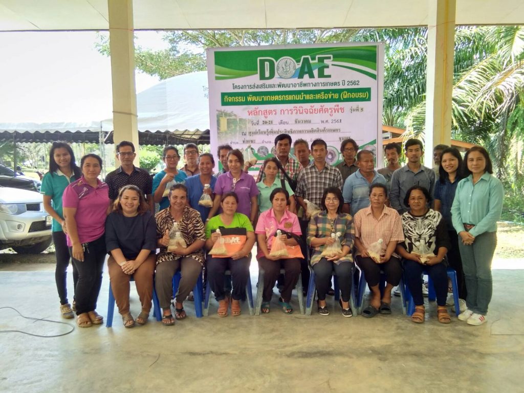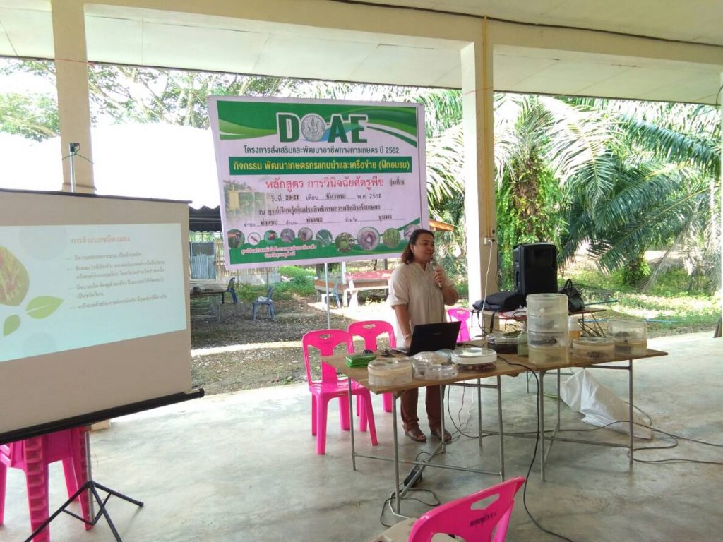 วันที่ 20-21 ธันวาคม 2561 นางชนิดา ตะเภาน้อย นักวิชาการส่งเสริมการเกษตรชำนาญการ ศูนย์ส่งเสริมเทคโนโลยีการเกษตรด้านอารักขาพืชจังหวัดสุราษฏร์ธานี พร้อมด้วย นายจิรยุทธ จิตราภิรมย์ นักวิชาการส่งเสริมการเกษตร ฝึกอบรมเกษตรกร ในโครงการส่งเสริมและพัฒนาอาชีพทางการเกษตร กิจกรรมพัฒนาเกษตรแกนนำและเครือข่าย รุ่นที่ 5 หลักสูตรการวินิจฉัยศัตรูพืช ณ ศูนย์เรียนรู้เพิ่มประประสิทธิภาพการผลิตสินค้าเกษตร ตำบลท่าเเซะ อำเภอท่าแซะ จังหวัดชุมพร โดยการฝึกวินิจฉัยศัตรูพืชจริงที่มีในพื้นที่ และสาธิตพร้อมทั้งฝึกปฏิบัติการผลิตขยายศัตรูธรรมชาติ มีเกษตรกรเข้ารับการฝึกอบรมในวันดังกล่าว จำนวน 30 ราย