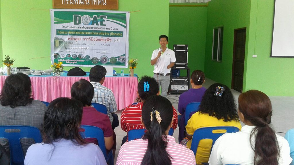 วันที่16-17 มกราคม 2562 นางชนิดา ตะเภาน้อย นักวิชาการส่งเสริมการเกษตรชำนาญการ ศูนย์ส่งเสริมเทคโนโลยีการเกษตรด้านอารักขาพืชจังหวัดสุราษฏร์ธานี พร้อมด้วย นายจิรยุทธ จิตราภิรมย์ นักวิชาการส่งเสริมการเกษตร ฝึกอบรมเกษตรกร ในโครงการส่งเสริมและพัฒนาอาชีพทางการเกษตร กิจกรรมพัฒนาเกษตรแกนนำและเครือข่าย รุ่นที่ 6 หลักสูตรการวินิจฉัยศัตรูพืช ณ ศาลาอเนกประสงค์หมู่ที่5 ตำบลนาเหนือ อำเภออ่าวลึก จังหวัดกระบี่ โดยการฝึกวินิจฉัยศัตรูพืชจริงที่มีในพื้นที่ และสาธิตพร้อมทั้งฝึกปฏิบัติการผลิตขยายศัตรูธรรมชาติ มีเกษตรกรเข้ารับการฝึกอบรมในวันดังกล่าว จำนวน 38 ราย