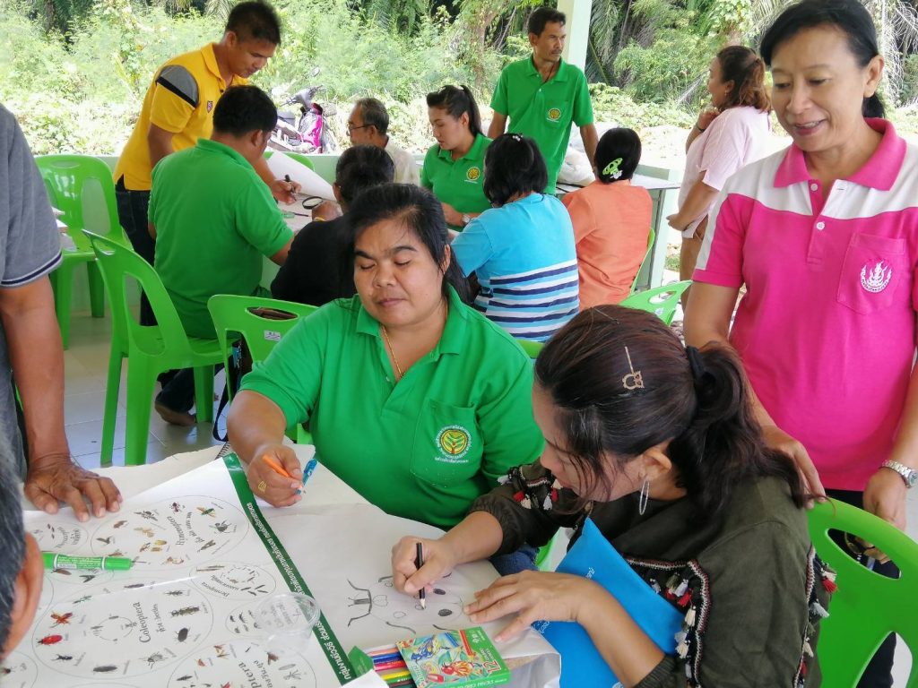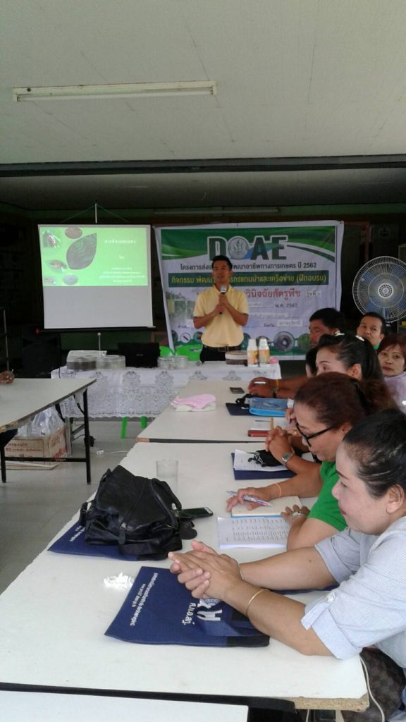 วันที่ 12 -13 กุมภาพันธ์ 2562 นางชนิดา ตะเภาน้อย นักวิชาการส่งเสริมการเกษตรชำนาญการ ศูนย์ส่งเสริมเทคโนโลยีการเกษตรด้านอารักขาพืชจังหวัดสุราษฏร์ธานี พร้อมด้วย นายจิรยุทธ จิตราภิรมย์ ฝึกอบรมเกษตรกรโครงการส่งเสริมและพัฒนาอาชีพการเกษตรปี 2562 กิจกรรมพัฒนาเกษตรกรแกนนำและเครือข่ายหลักสูตรการวินิจฉัยศัตรูพืชรุ่นที่ 9ณ ศูนย์เรียนรู้เพิ่มประสิทธิภาพการผลิตสินค้าเกษตรอำเภอดอนสัก จังหวัดสุราษฎร์ธานี มีเกษตรกรเข้ารับการฝึกอบรมจำนวน 30 ราย