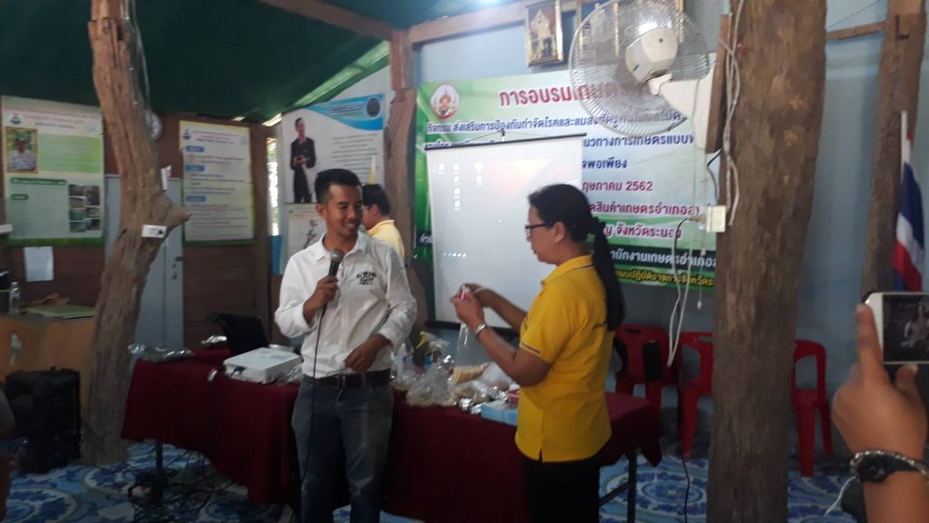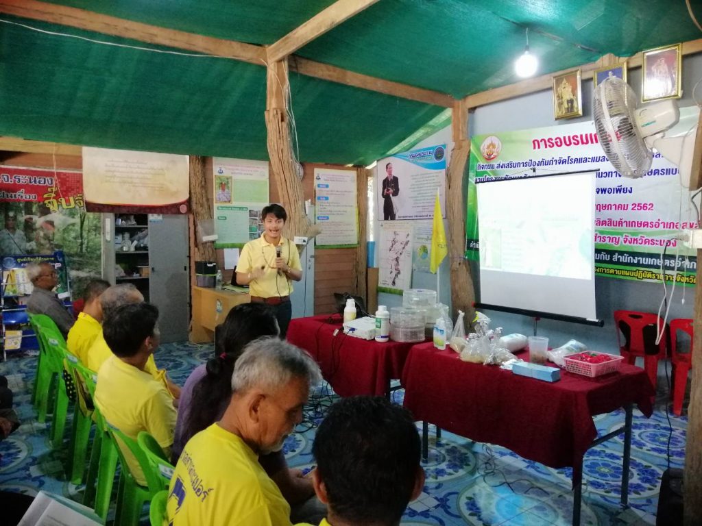 วันที่ 15 พฤษภาคม 2562 นายชัยพร นุภักดิ์ ผู้อำนวยการศูนย์ส่งเสริมเทคโนโลยีการเกษตรด้านอารักขาพืชจังหวัดสุราษฎร์ธานี มอบหมายให้นายจิรยุทธ จิตราภิรมย์ นักวิชาการส่งเสริมการเกษตร พร้อมด้วยนายภานุรักษ์ ประทับกอง นักวิชาการส่งเสริมการเกษตรและคณะ ถ่ายทอดความรู้การใช้เชื้อจุลินทรีย์ควบคุมศัตรูพืชและการผลิตขยาย ณ ศูนย์เรียนรู้การเพิ่มประสิทธิภาพการผลิตสินค้าเกษตร (ศพก.) อำเภอสุขสำราญ จังหวัดระนอง มีเกษตรกรเป้าหมายจำนวน 50 ราย