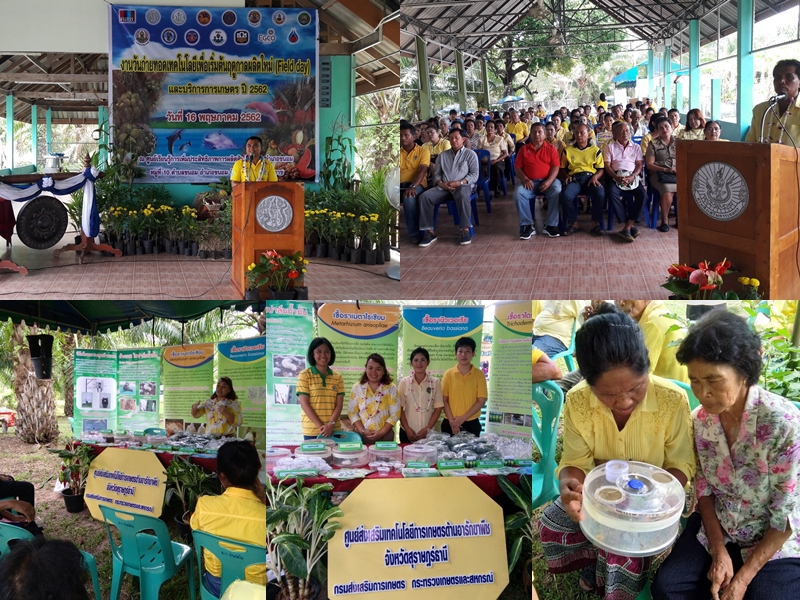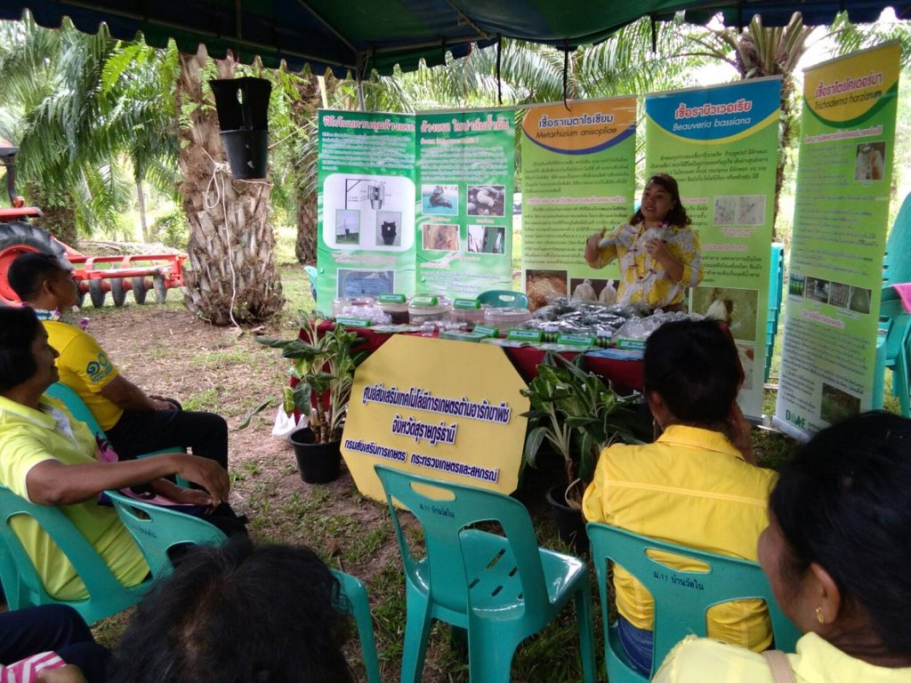 วันที่ 16 พฤษภาคม พ.ศ. 2562 นายชัยพร นุภักดิ์ ผู้อำนวยการศูนย์ส่งเสริมเทคโนโลยีการเกษตรด้านอารักขาพืชจังหวัดสุราษฎร์ธานี มอบหมายให้นางชนิดา ตะเภาน้อย นักวิชาการส่งเสริมการเกษตรชำนาญการ และเจ้าหน้าที่ศทอ.สฎ.พร้อมด้วยเจ้าหน้ากองอารักขาพืชและจัดการดินปุ๋ย กรมส่งเสริมการเกษตร เข้าร่วมงานและจัดนิทรรศการถ่ายทอดความรู้ด้านการป้องกันกำจัดศัตรูปาล์มน้ำมัน ในงานวันถ่ายทอดเทคโนโลยีสู่เกษตรกร (Field Day) ณ ศูนย์เรียนรู้การเพิ่มประสิทธิภาพการผลิตสินค้าเกษตร ตำบลขนอม อำเภอขนอม จังหวัดนครศรีธรรมราช ซึ่งทางศทอ.สฎ.ได้ให้ความรู้ในด้านการป้องกันกำจัดศัตรูพืชในสวนปาล์มน้ำมันและมะพร้าว พร้อมทั้งแนะนำการใช้เชื้อจุลินทรีย์ในการป้องกันกำจัดศัตรูพืช และสนับสนุนเชื้อจุลินทรีย์ป้องกันกำจัดศัตรูพืช จำนวน 60 กิโลกรัม โดยมีเกษตรกรเข้าร่วม 100 ราย