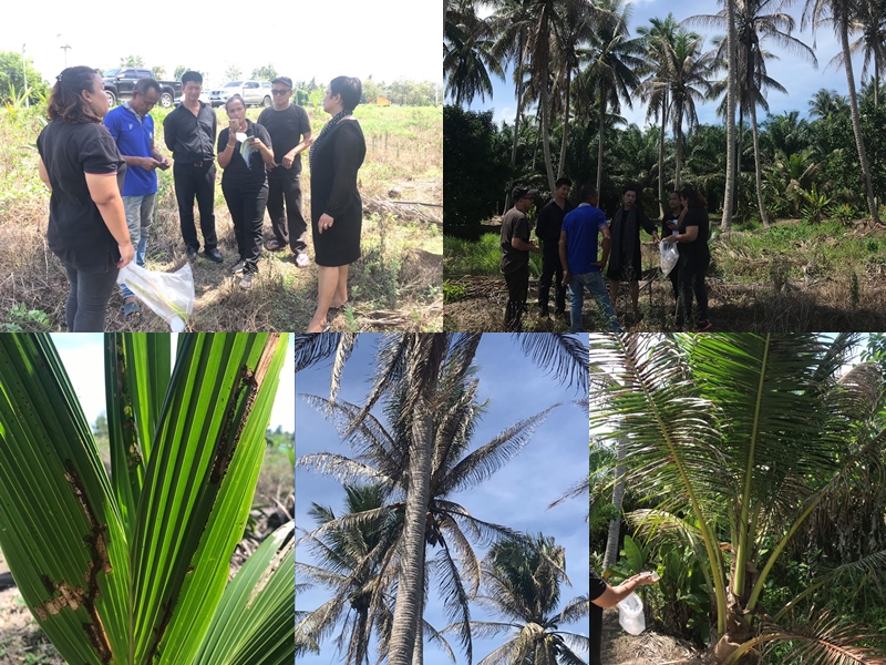 วันที่ 28 พฤษภาคม 2562 นายชัยพร นุภักดิ์ ผู้อำนวยการศูนย์ส่งเสริมเทคโนโลยีการเกษตรด้านอารักขาพืชจังหวัดสุราษฎร์ธานี มอบหมายให้นางชนิดา ตะเภาน้อย นักวิชาการส่งเสริมการเกษตรชำนาญการ ร่วมกับนางลัดดาวัลย์ วัฒโน เกษตรอำเภอเมืองสุราษฎร์ธานี และเจ้าหน้าที่จากสำนักงานเกษตรอำเภอเมืองสุราษฎร์ธานี ติดตามการระบาดศัตรูมะพร้าวแปลงของนางสมพิศ เย็นสบาย . พื้นที่หมู่ที่ 6 ตำบลคลองน้อย อำเภอเมือง จังหวัดสุราษฎร์ธานี พื้นที่ปลูกมะพร้าว 3 ไร่ โดยพบการระบาดของหนอนหัวดำมะพร้าวก้ดกินทางใบล่าง พื้นที่การระบาด 1 ไร่ ซึ่งทางสำนักงานเกษตรอำเภอและศทอ.สฎ.ได้แนะนำวิธีการป้องกันกำจัด โดยการฉีดสารอิมาเม็กตินเบนโซเอต (1.92% EC) อัตรา 30 มิลลิลิตรต่อต้น พร้อมทั้งสนับสนุนแตนเบียนบราคอน ฮีบีเตอร์ จำนวน 2,000 ตัว ปล่อยในพื้นที่ระบาดดังกล่าว